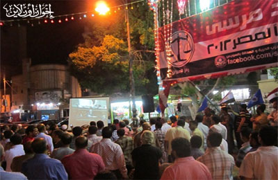 وشهد الاحتفال شاشات عرض كبيرة تعرض مقتطفات من سيرة الدكتور مرسي ونضاله في مجلس الشعب ومحاربته للفساد، وتم توزيع السيرة الذاتية، كما تم عمل سلاسل بشرية شبابية أمام المقر الانتخابي الرئيسي للحملة.