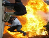 متظاهران يهربان من النيران المشتعلة بالسفارة الدنماركية بدمشق