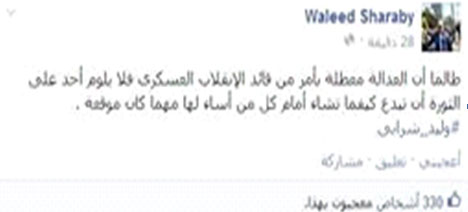 وكتب عبر صفحته في "فيس بوك " : طالما أن العدالة معطلة بأمر من قائد الإنقلاب العسكري فلا يلوم أحد على الثورة أن تبدع كيفما تشاء أمام كل من أساء لها.