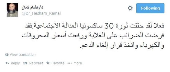 سخر الدكتور هشام كمال المتحدث الإعلامي باسم الجبهة السلفية بمصر من مؤيدي الانقلاب, لأن الانقلابيين حققوا لهم العدالة الاجتماعية المنشودة ففرضوا الضرائب ورفعوا أسعار المحروقات والكهرباء وألغوا الدعم .