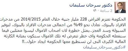 وكتب على صفحته في "فيس بوك": الحكومة تعتزم اقتراض 228 مليار جنيه خلال العام 2014/2015 من مدخرات الأفراد بالبنوك، تعادل نحو 49% من إجمالي مدخرات الأفراد بالبنوك، لتوفير السيولة وسد العجز..