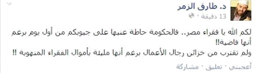وكتب عبر صفحته في " فيس بوك " :لكم الله يا فقراء مصر.. فالحكومة حاطة عنيها على جيوبكم من أول يوم برغم أنها فاضية!!
