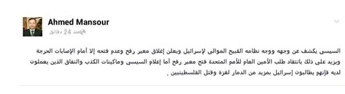 أشار الإعلامي أحمد منصور إلى أن السيسي قد كشف عن خسته وانتمائه الحقيقي عندما أغلق معبر رفح أمام إخوتنا الفلسطينيين إلا للحالات الحرجة ويزيد الأمر برفض طلب الأمم المتحدة بفتح المعبر !