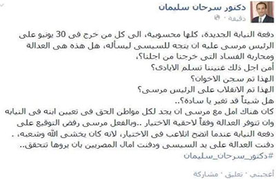 أكد الكاتب الدكتور سرحان سليمان أن دفعة النيابة الجديدة التي عينت مؤخرًا كلها "محسوبية"، مطالبًا كل من خرج في 30 يونيو على الرئيس الشرعي مرسي عليه أن يتجه لقائد الانقلاب ليسأله، هل هذه هي العدالة ومحاربة الفساد التي خرجنا من أجلها؟