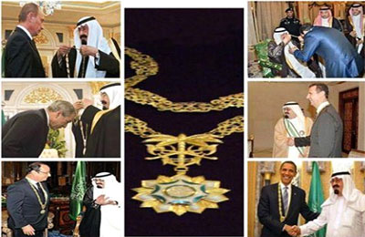 بينما تظهر صورا أخري إحترام ملك السعودية لكل رؤساء العالم ، وإعطاهم القلادة وهو واقف تقديرا لهم .