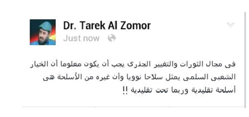 وأضاف عبر صفحته على موقع التواصل الإجتماعي " فيسبوك " أن غير هذا السلاح يعد سلاحا تقليديا أو تحت التلقيدي وذلك ردا على من الدعاوى التى انتشرت مؤخرا المطالبة بأن تكون ثورتنا ثورة مسلحة وأن تتخلى عن سلميتها .