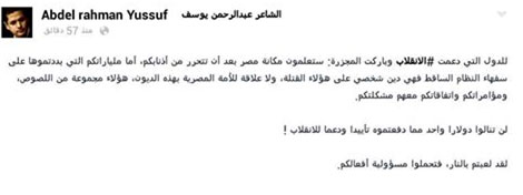 وجه الشاعر عبدالرحمن يوسف رسالة الى الدول التي دعمت الانقلاب وباركت المجزرة بأنهم سيعلمون مكانة مصر بعد أن تتحرر من أذنابهم، أما ملياراتكم التي بددتموها على سفهاء النظام الساقط فهي دين شخصي على هؤلاء القتلة، ولا علاقة للأمة المصرية بهذه الديون، هؤلاء مجموعة من اللصوص، ومؤامراتكم واتفاقاتكم معهم مشكلتكم.