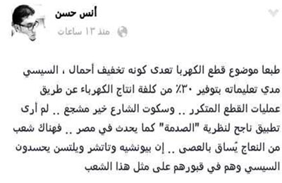 أكد الكاتب الصحفي أنس حسن أن سكوت الشارع على انقطاع الكهرباء هو خير مشجع لتنفيذ تعليمات السيسي بتوفير 30% من كلفة إنتاج الكهرباء عن طريق عمليات القطع المتكررة.