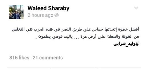وقال على موقع التواصل الاجتماعي "فيس بوك": "أفضل خطوة اتخذتها حماس على طريق النصر في هذه الحرب هي التخلص من الخونة والعملاء على أرض غزة... يا ليت قومي يعلمون".