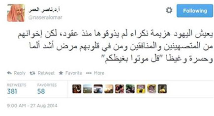 وكتب  في تغريدة عبر "تويتر": "يعيش اليهود هزيمة نكراء لم يذوقوها منذ عقود، لكن إخوانهم من المتصهينين والمنافقين ومن في قلوبهم مرض أشد ألما وحسرة وغيظًا "قل موتوا بغيظكم".