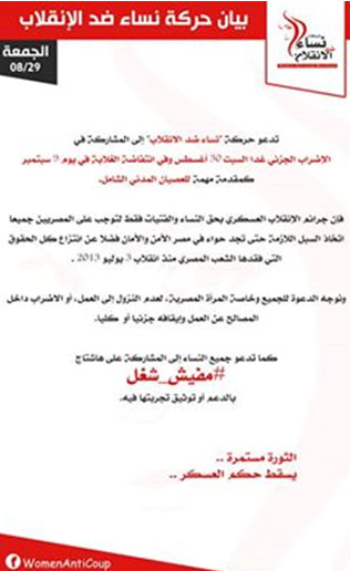 دعت حركة "نساء ضد الانقلاب" إلى المشاركة في الإضراب الجزئي غدًا السبت 30 أغسطس وفي انتفاضة الغلابة يوم 9 سبتمبر كمقدمة مهمة للعصيان المدني الشامل.