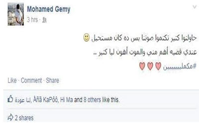 تداول النشطاء على مواقع التواصل الاجتماعي صورة لآخر تدوينات الشهيد محمد جمال، شهيد منطقة عين شمس برصاص ميليشيات الانقلاب اليوم والتي كتب فيها: "حاولتوا كتير تكمموا صوتنا بس ده مستحيل, عندي قضية أهم والموت أهون ليا كتير".