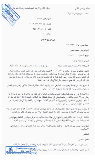 نشر المحامي أحمد حلمي محامي المعتقل محمد صلاح سلطان والمضرب عن الطعام في سجون الانقلاب لليوم 241 تقريرًا طبيًّا للطبيب المعالج لمحمد سلطان يؤكد تدهور حالته الصحية وخطورة استمرار حبسه.