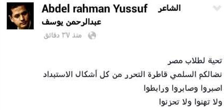 وجه الشاعر عبدالرحمن يوسف رسالة للطلبة قائلاً: "اصبروا وصابروا ورابطوا ولاتهنوا ولا تحزنوا".