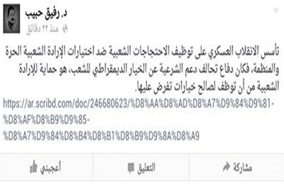 وأضاف على "فيس بوك": تأسس الانقلاب العسكري على توظيف الاحتجاجات الشعبية ضد اختيارات الإرادة الشعبية الحرة والمنظمة، فكان دفاع تحالف دعم الشرعية عن الخيار الديمقراطي للشعب، هو حماية للإرادة الشعبية من أن توظف لصالح خيارات تفرض عليها .