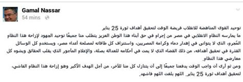 وأضاف " ومن ثم أرى أن واجب الوقت يدفعنا جميعًا إلى أن يتنازل كل منا للآخر، من أجل الهدف الأكبر وهو إزاحة هذا النظام الفاشي، لتحقيق أهداف ثورة 25 يناير. "