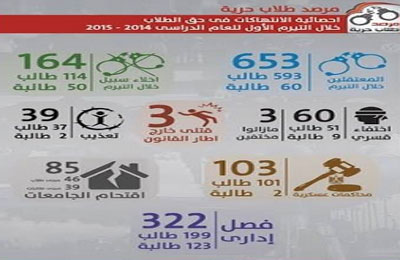 وفي إطار الرصد المستمر لتلك الانتهاكات, أجرى مرصد طلاب حرية إحصائية توضح إجمالي الانتهاكات بحق الطلاب خلال الفصل الدراسي الأول من العام الحالي فكانت الإحصائية كالآتي :