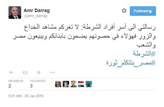 وقال في تغريدة علي موقع التواصل الاجتماعي "تويتر": "رسالتي إلى أسر أفراد الشرطة: لا تغركم مشاهد الخداع والزور فهؤلاء في حصونهم يضحون بأبنائكم ويبيعون مصر والشعب".