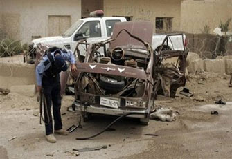 ضابط عراقي يفحص سيارة مدمرة