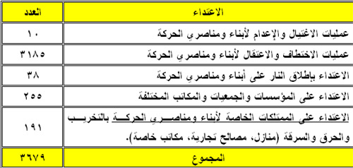 وخلال عامين تعرضت الحركة بالمجمل لـ4293 حادثة اعتداء، تنوعت بين عمليات القتل ومحاولة القتل والاختطاف والتعذيب والتنكيل ومداهمة المنازل وتخريب المؤسسات وإغلاقها ووقف العمل في الكثير منها وفصل الموظفين.