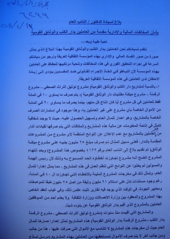 واتهم البلاغ الوزير بتوزيع المكافآت الشهرية على الموظفين بمكتب الثقافة الأسبق فاروق حسني وضباط الشرطة من ميزانية الدار؛ مما مثل إهدارًا للمال العام، بالإضافة إلى المكافآت المبالغ فيها للعاملين بمكتبه، وانتداب تلاميذه وأصدقائه من الجامعات لتولي المناصب القيادية بدار الكتب والوثائق ومنهم الدكتور عبد الواحد النبوي رئيس دار الوثائق الحالي.
