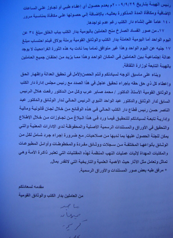 وحصل (إخوان أون لاين) على المستندات التي تقدم بها العاملون بدار الكتب والوثائق ليضعها أمام الأجهزة الرقابية المنوط بها اتخاذ الإجراءات اللازمة.
