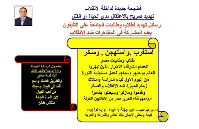 عـــــاوز يستدرج الثوار للعنف حتى يتمكن من تحقيق اهداف أسياده الأمريكان واليهود عبر استخدام النار بقوة لقتل والتخلص من الكتلة الحرجة من القيادات الوطنية بالمعتقلات وسحق الثوار بالدبابات .... لن نمنحك هذا المبرر أيها الخائن الخسيس وسنكمل مسيرتنا بخطتنا نحن وليس بخطتك انت