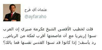 وجاء ذلك فى تدوينة للإعﻻمى "عثمان آي فرج"؛ حيث قال: "قلت لخطيب اﻷقصى الشيخ عكرمة صبرى ،إن العرب قد نسوا إريتريا مع أن عاصمتها أقرب لمكة من الرياض.. رد بكل أسف إذا كانوا قد نسوا "القدس" نفسها فما بالك ؟.