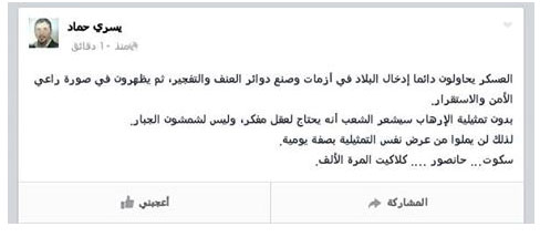أكد الدكتور يسري حماد نائب رئيس حزب الوطن وعضو التحالف الوطني لدعم الشرعية ورفض الانقلاب أن المسلسل الهزلي الذي ينفذه اﻻنقلاب كل فترة من تفجيرات وهمية تهدف إلى فرض سيطرته على الناس من خلال عدم إشعارهم بالأمن.