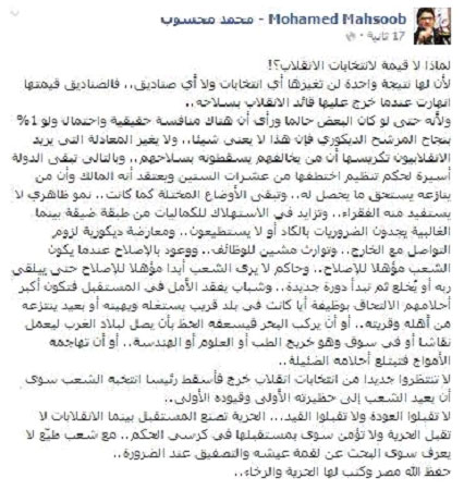 وأوضح محسوب: "لا تنتظروا جديدًا من انتخابات انقلاب خرج فأسقط رئيسًا انتخبه الشعب سوى أن يعيد الشعب إلى حظيرته الأولى وقيوده الأولى لا تقبلوا العودة، ولا تقبلوا القيد الحرية تصنع المستقبل بينما الانقلابات لا تقبل الحرية ولا تؤمن سوى بمستقبلها في كرسي الحكم، مع شعب طيّع لا يعرف سوى البحث عن لقمة عيشه والتصفيق عند الضرورة.