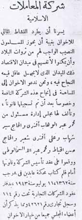 أنشأ الإخوان مجموعةً من الشركات كانت أسهُمُها جميعًا موزَّعةً على مجموعةٍ كبيرةٍ جدًّا من المساهمين، بعكس ما ألِفَ الناس في الشركاتِ الكبيرةِ في مصر التي يتحكَّم فيها ويملك غالبيةَ أسهمها قلةٌ من الرأسماليين؛ ولعلَّ أوضح مثال لذلك هو شركة الإخوان المسلمين للغزل والنسيج، فرأس المال الفعلي لها كان 6500 جنيه، وكان عدد المساهمين 550 مساهمًا، ومعظمهم من العمال، ومن هذه الشركات: