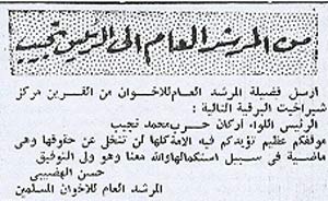 أرسل فضيلة المرشد العام بالبرقية التالية إلى الرئيس اللواء أركان حرب محمد نجيب قال فيها: