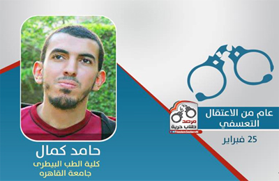 وقال المرصد عبر موقعه : ” حامد كمال ” طالب بكلية الطب البيطري – جامعة القاهرة ، تم إعتقاله عشوائيًا يوم 25 فبراير 2014 من أعلی كوبري بهتيم الساعة التاسعة والنصف ، و تعرض للضرب الشديد على رأسه حتى فقد وعيه وأفاق فى قسم ثانى شبرا عن طريق ضربه بالأحذية على كل جسده ، وقد تم نقله إلى معسكر قوات الأمن ببنها ، حيث عرض هناك على نيابة جنوب بنها التى أحالته إلى المحاكمة العسكرية بعد ذلك .