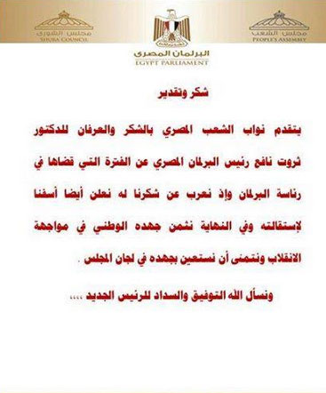 تقدم البرلمان المصري بالشكر والعرفان للدكتور ثروت نافع رئيس البرلمان المصري السابق عن الفترة التى قضاها عن رئاسة البرلمان.