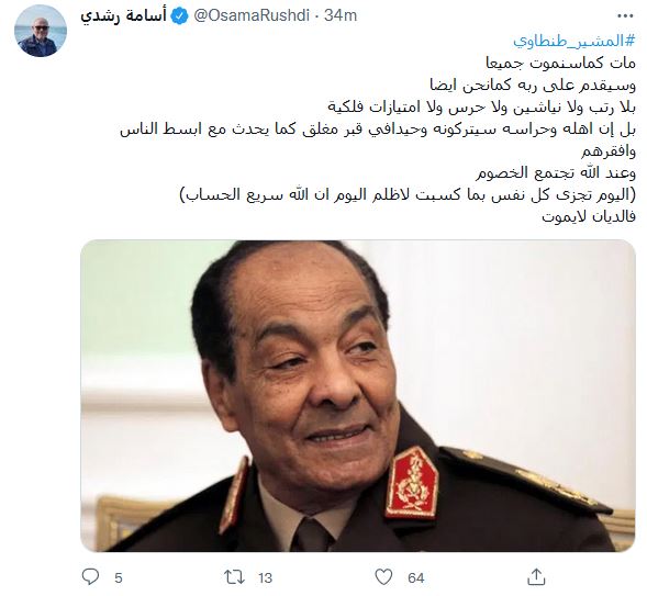 وعلق كثيرمن المعلقين على وفاة طنطاوي فكتب الحقوقي والإعلامي هيثم أبو خليل  على بدء المحاكمة العادلة للمشير في: